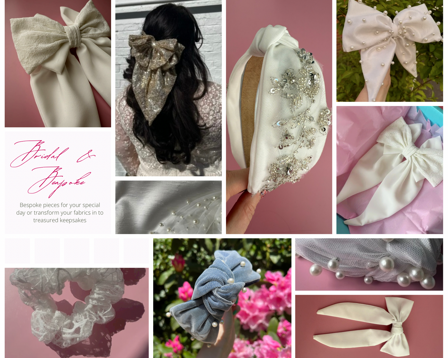 Whether you’re looking for a bespoke bridal piece designed just for you, or you’d like to transform fabric from your dress or veil into a keepsake, each item is created with care and attention to detail.
